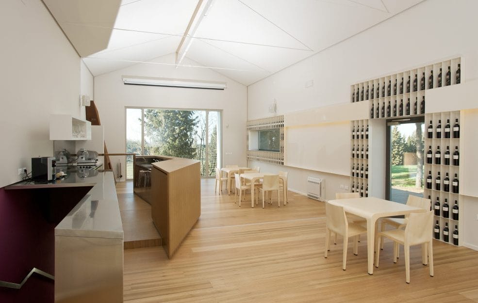 La struttura recuperata del Fienile, inaugurata a marzo 2019, è caratterizzata da due sale per l’ospitalità, la barricaia e la sala di affinamento per lo Spumante Metodo Classico.